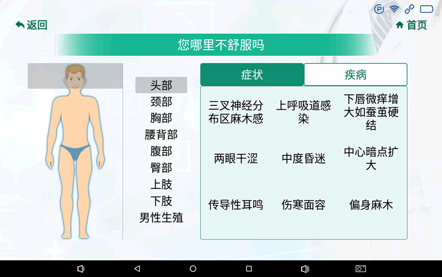 1.通過(guò)點(diǎn)擊首頁(yè)預(yù)檢分診按鈕或語(yǔ)音“預(yù)檢分診”進(jìn)入性別和年齡選擇頁(yè)面,通過(guò)點(diǎn)擊屏幕或直接語(yǔ)音如(30歲男性)選擇患者的性別和年齡,然后跳轉(zhuǎn)到癥狀或疾病選擇頁(yè)面;