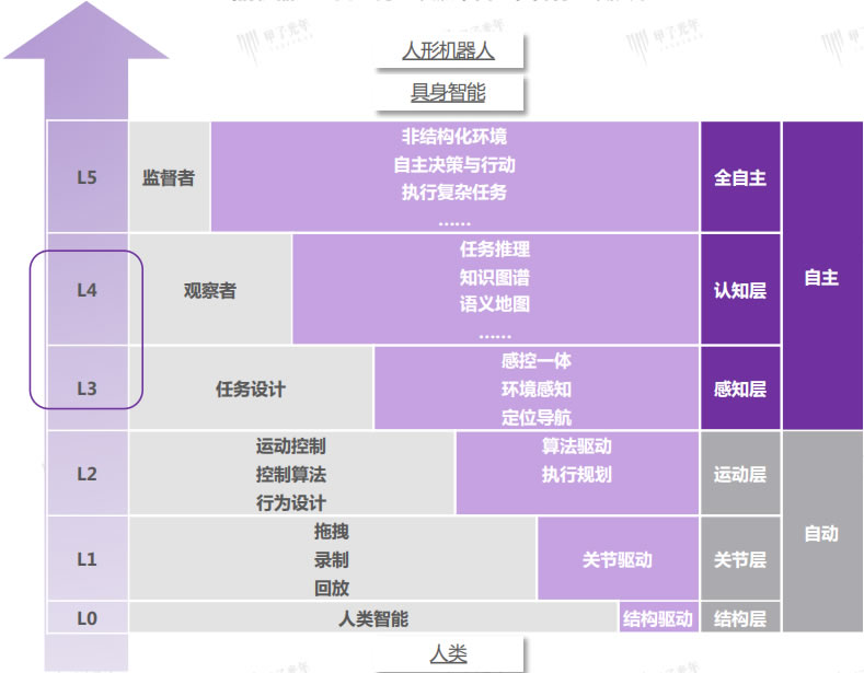 第三代為智能機(jī)器人(L4-L5):擁有更豐富的傳感器和更G的智能水平,不僅能獲取并處理外部綜合信息,甚至能據(jù)此自己制定行動(dòng)目標(biāo),其智能主要體現(xiàn)在感知交互、獨(dú)立決策、自我優(yōu)化三個(gè)方面。
