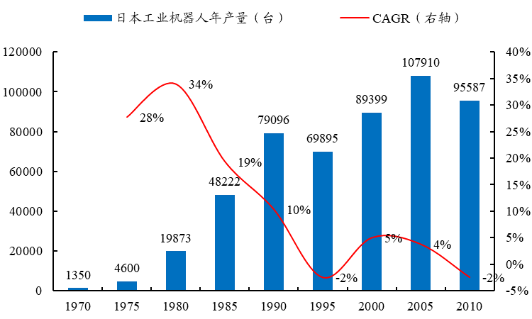 日本工業(yè)機器人年產量由 1970 年的 1350 臺猛增到 1980 年的 19843 臺,年均增長率為 30.8%,處于爆發(fā)性增長的 初級階段。