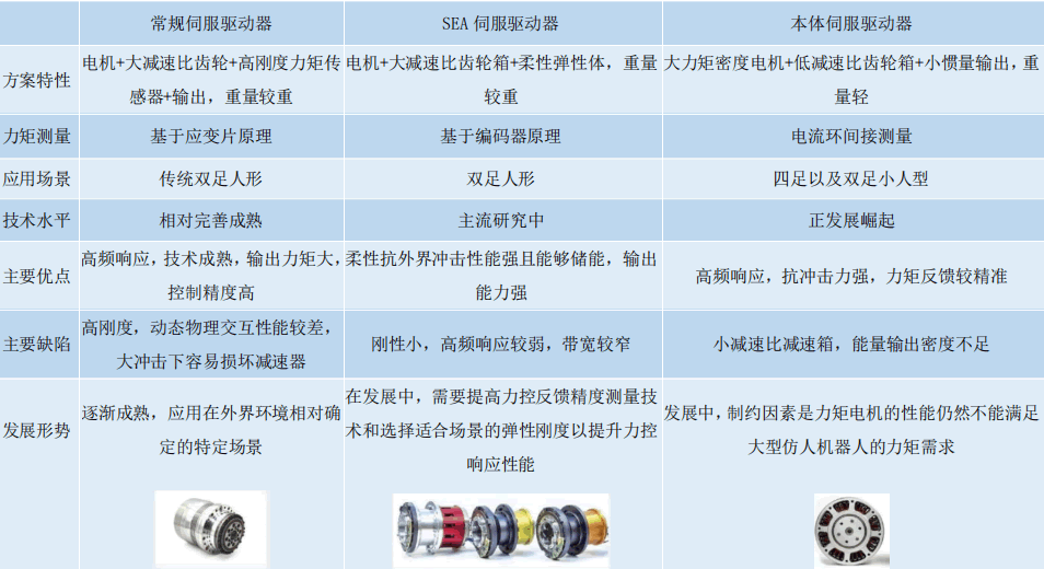 伺服驅(qū)動(dòng)器、本體伺服驅(qū)動(dòng)器。常規(guī)伺服驅(qū)動(dòng)器主要由力矩電機(jī)、諧波減速器、電機(jī)編碼器、輸出