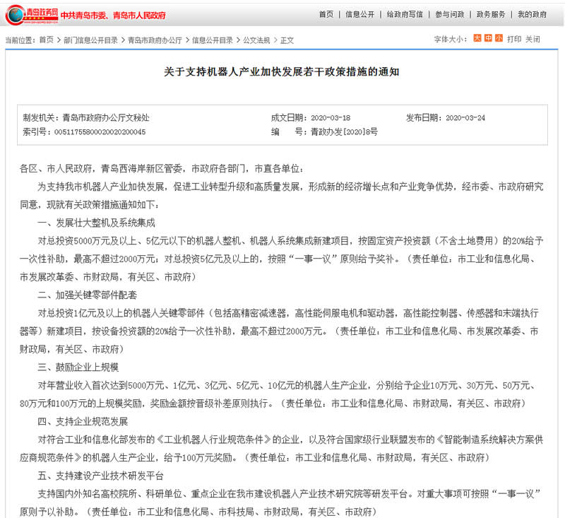 2020年3月18日,青島市政府辦公廳印發(fā)《關(guān)于支持機器人產(chǎn)業(yè)加快發(fā)展若干政策措施的通知》,出臺支持機器人產(chǎn)業(yè)發(fā)展的6大方面10條措施。這是山東省內(nèi)出臺的D一個機器人產(chǎn)業(yè)政策,其政策優(yōu)惠力度在全國J具競爭力。其中,在引進培育機器人整機及系統(tǒng)集成企業(yè)、鼓勵產(chǎn)品研發(fā)等方面,該政策創(chuàng)新力度實現(xiàn)新突破。