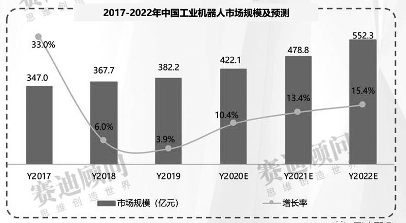 2019年,工業(yè)機(jī)器人市場規(guī)模受下游汽車、電子電氣等行業(yè)景氣度下滑的影響,增速較上年放緩,呈現(xiàn)下降趨勢,但總體市場規(guī)模仍然呈現(xiàn)穩(wěn)定上升趨勢,達(dá)382.2億元,預(yù)計(jì)到2022年,工業(yè)機(jī)器人市場規(guī)模將進(jìn)一步增長,達(dá)到552.3億元 。