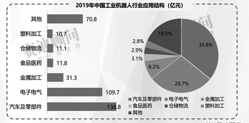 2019年,汽車及零部件在中國工業(yè)機(jī)器人市場的行業(yè)應(yīng)用占比為35.8%;電子電氣占比為28.7%;金屬加工占比8.2%;食品醫(yī)藥占比3.1%;倉儲(chǔ)物流占比2.9%;塑料加工占比 2.8%;其它L域占比18.5%。