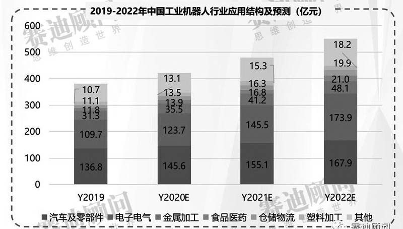 未來三年,工業(yè)機(jī)器人行業(yè)應(yīng)用結(jié)構(gòu)的總體格局基本保持不變。到2022年,汽車及零部件、電子電氣仍然占據(jù)大比重,隨著制造業(yè)轉(zhuǎn)型升級(jí)進(jìn)程的不斷加速,將為金屬加工、食品醫(yī)藥、倉儲(chǔ)物流等應(yīng)用行業(yè)帶來更大的市場空間。